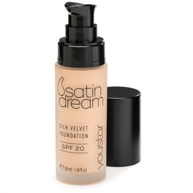 Το υγρό foundation SATIN DREAM της Youstar δημιουργεί μια μεταξένια λεία, φυσικά ομοιόμορφη επιδερμίδα. Είναι η τέλεια βάση για το μακιγιάζ σας που εξομαλύνει το δέρμα και διορθώνει τις ατέλειες. Η ενυδατική και θρεπτική του φόρμουλα με μέτρια κάλυψη αγκαλιάζει την επιδερμίδα σαν μετάξι! Περιέχει SPF 20 φυσικής προέλευσης για καθημερινή αντηλιακή προστασία. – Για όλους τους τύπους δέρματος – Για άψογο, φυσικό αποτέλεσμα – Μεταξένια υφή – Θρεπτική και ενυδατική φόρμουλα – Vegan – Χωρίς paraben C20 Για ανοιχτόχρωμες επιδερμίδες με χρυσαφένιο υποτόνο