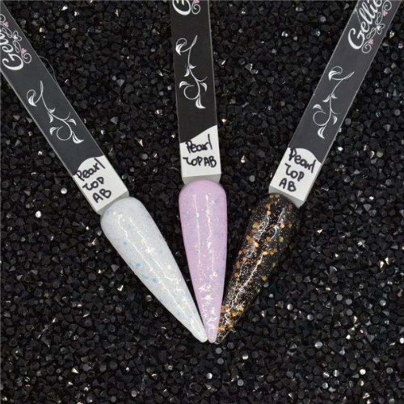 Gellie Pearl Top – AB 01 -Top Coat για ημιμόνιμο, χωρίς κολλώδη επιφάνεια ( No wipe ) – Διάφανο με πούλιες και glitter σε ιριδίζον χρώμα – 10ml